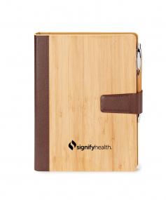 Bamboo and vinyl trim journal cover with vinyl lining, matching pen loop (pen not included) and a refillable spiral bound ECO journal containing 200 ivory lined pages. Bamboo is a natural fiber. 9 1/4" H x 7 1/16" W x 1 1/4" thick.
