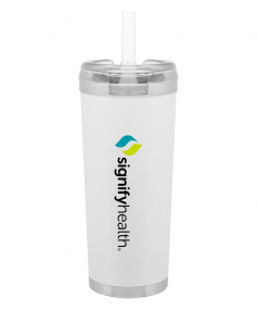 24 oz double wall 18/8 stainless steel thermal tumbler with copper vacuum insulation, stainless steel rim and base, threaded Eastman Tritan lid, snap closure, straw opening, and flexible wide silicone straw.