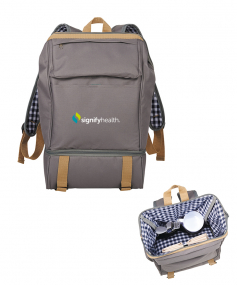 11pc Café Picnic Backpack for Two. The main compartment has a wide opening to easily access the picnic pieces. The separate PEVA insulated cooler storage compartment fits 6 cans. Set includes 2 each: 8" plates, mugs, forks, spoons, and napkins. Complies with Prop 65. 16.5" H x 9.5" W x 6.25" L