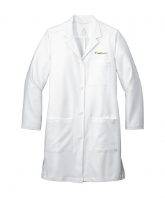 This lab coat is made with 65/35 poly/cotton poplin and features a locker loop, left chest pocket with pen slot, top-loading front pockets, an interior tablet pocket, a side seam opening for easy access to pants pockets, a back yoke, a 4-button placket opening, center back vent, and the WonderWink® heat transfer logo at left pocket. Modern fit. Medium size is 38" back length.